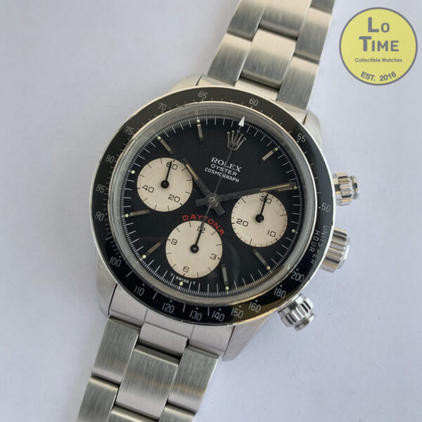 Descrizione : Rolex Daytona 6263 in condizioni veramente eccezionali. Daytona come pochi se ne trovano ancora. La cassa è davvero bella, pienissima e ben spigolosa. Il quadrante Big Red nero è semplicemente spettacolare (oltre che ovviamente corretto per il seriale), tutti e dico tutti i pallini di trizio sono intatti e virati ad una patina giallo burro tenue con sfere in perfetto matching. Ghiera mark III in perfetto stato, non rotta né rovinata, stupenda e soprattutto corretta per il seriale. Bracciale Rolex oyster 78350, finali 571, in stato eccezionale, leggerissimo lasco e clasp I12, coeva pure quella. 6263 da capogiro…